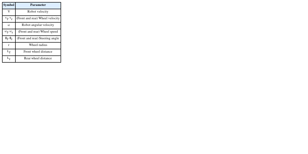 조향각(ϕf, ϕr)과 휠 속도(ωf, ωr)를 입력으로 받아 로봇의 속도(V)와 각속도(ω)를 계산하며, 다음과 같이 나타낼 수 있다.