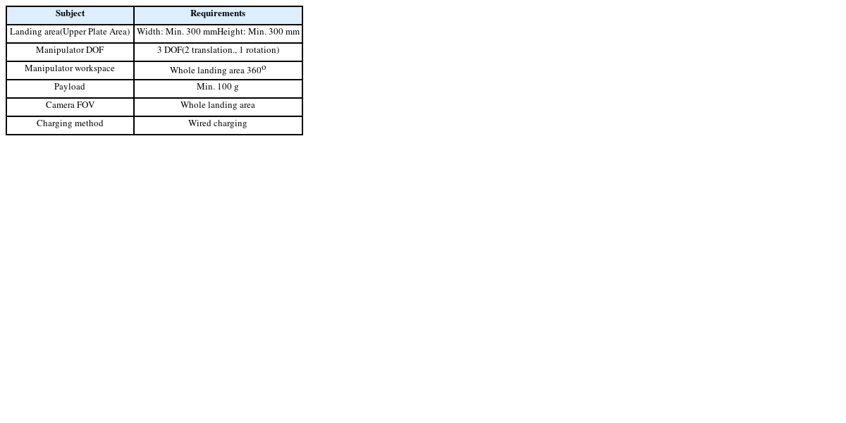 o 회전하는 작업영역(Workspace)을 갖도록 설계하였다. 머니퓰레이터의 End-Effector는 착륙한 드론을 전자석의 자기력으로 부착하여 목표 위치와 자세로 이동시키기 위해 소형 드론 무게 이상의 페이로드를 가져야 한다. 대표적인 상용 소형 드론(DJI Tello, DJI, China)의 무게가 87 g이므로 약 15%의 안전계수를 적용해 머니퓰레이터의 최소 페이로드가 100 g이 되도록 전자석 등의 부품을 선정하였다.