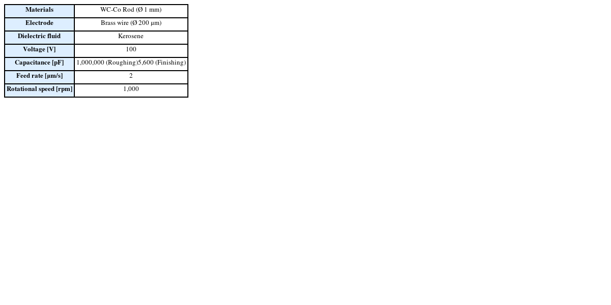 19]. The electrode fabrication process is as follows: A brass wire connected to the cathode is transported at a constant speed along a guide. An WC-Co rod with a diameter of 1 mm is connected to the anode and rotated at 1000 rpm. The rotating electrode is transported vertically along the Z-axis. Electrical discharge occurs in the gap between the brass wire and the WC-Co rod, fabricating the cylindrical electrode. Debris flushing occurs simultaneously with electrode fabrication due to the rotation of the rod.
