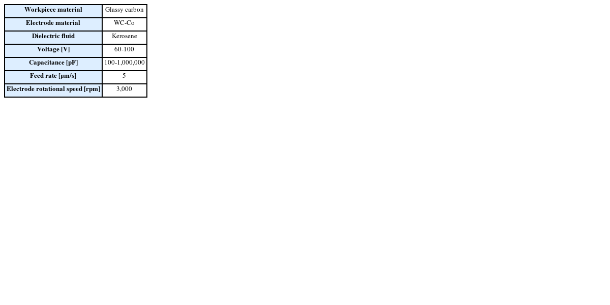 14] performed EDM on glassy carbon, exploring machining conditions according to working fluid, electrode rotational speed, voltage and duty factor. However, previous studies have primarily focused on the fabricating molds and dies for forming optical glass devices, and there is a lack of research on the machining of micro holes on GC.