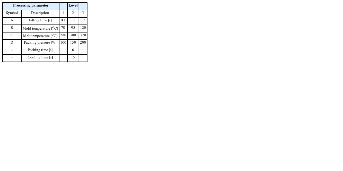 충전 시간(A)의 범위는 성형 품질에 미치는 영향을 고려하여 0.1-0.5 s로 설정하였다. 금형 온도(B)와 용융 온도(C)는 연구에서 가정한 범용 폴리카보네이트 소재의 권장 성형 온도 범위를 기준으로 각각 70-120oC, 280-320oC로 설정하였다. 보압 압력(D)은 공정 변수 조합에 따라 변하는 사출 압력에 대해서 최소한의 보압 효과를 보장하기 위해, 보압 절환 압력을 기준으로 하는 백분율 값인 100-200%로 설정하였다.