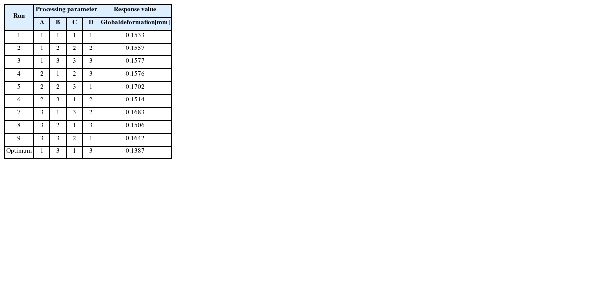 Table 2의 공정변수 조합을 이후 진행될 변형 해석에 활용하였다.