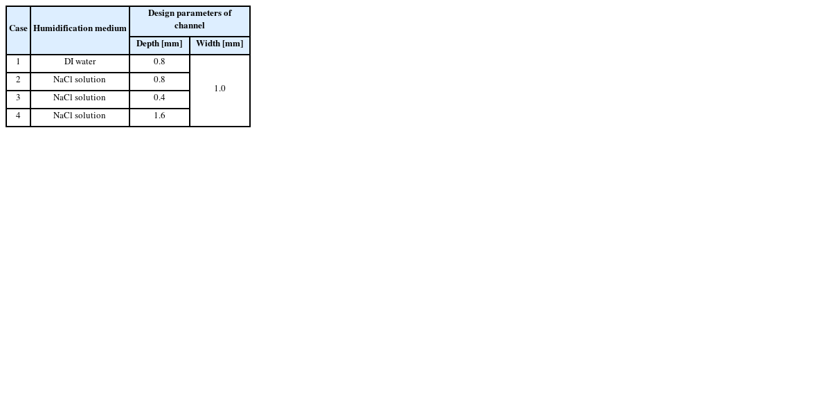 Table 1에 나열하였다. 먼저 동일한 유로 깊이(0.8 mm)를 가진 단위 셀에 DI Water와 NaCl 수용액을 각각 가습시킨 실험결과를 비교하여 NaCl 오염의 영향을 확인하였다. 이후 유로 깊이가 더 낮은 경우(0.4 mm)와 더 깊은 경우(1.6 mm)에 대해 실험을 진행하고 결과를 비교하였다. 모든 Case에서 유로와 격벽(Rib)의 폭은 각각 1.0과 1.1 mm로 일정하다.