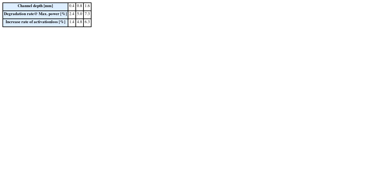 2로 1.4% 증가하였다. 반면에 유로 깊이가 1.6 mm인 경우, 활성화 저항은 361.6에서 384.4 mΩ·cm