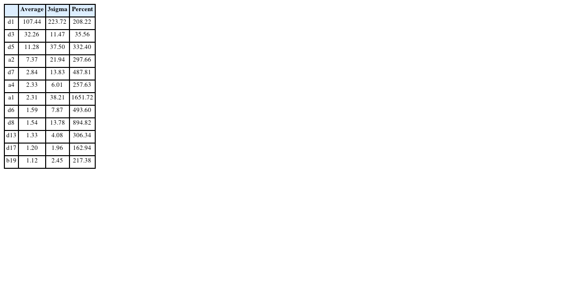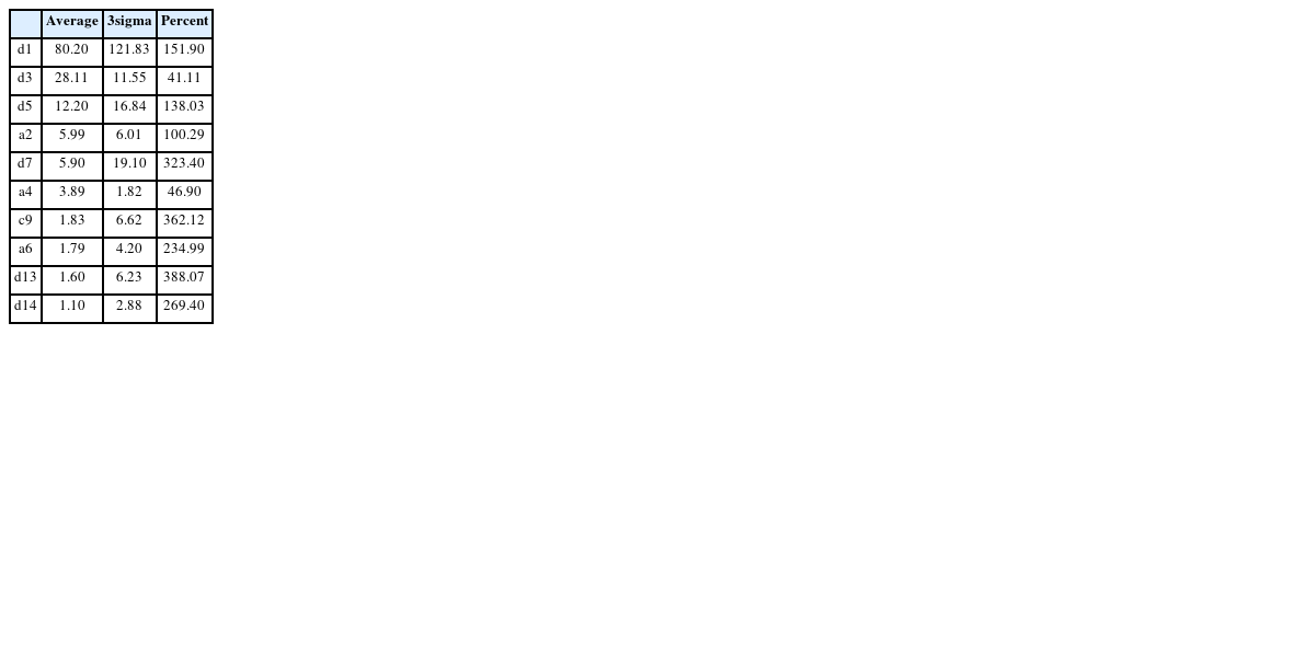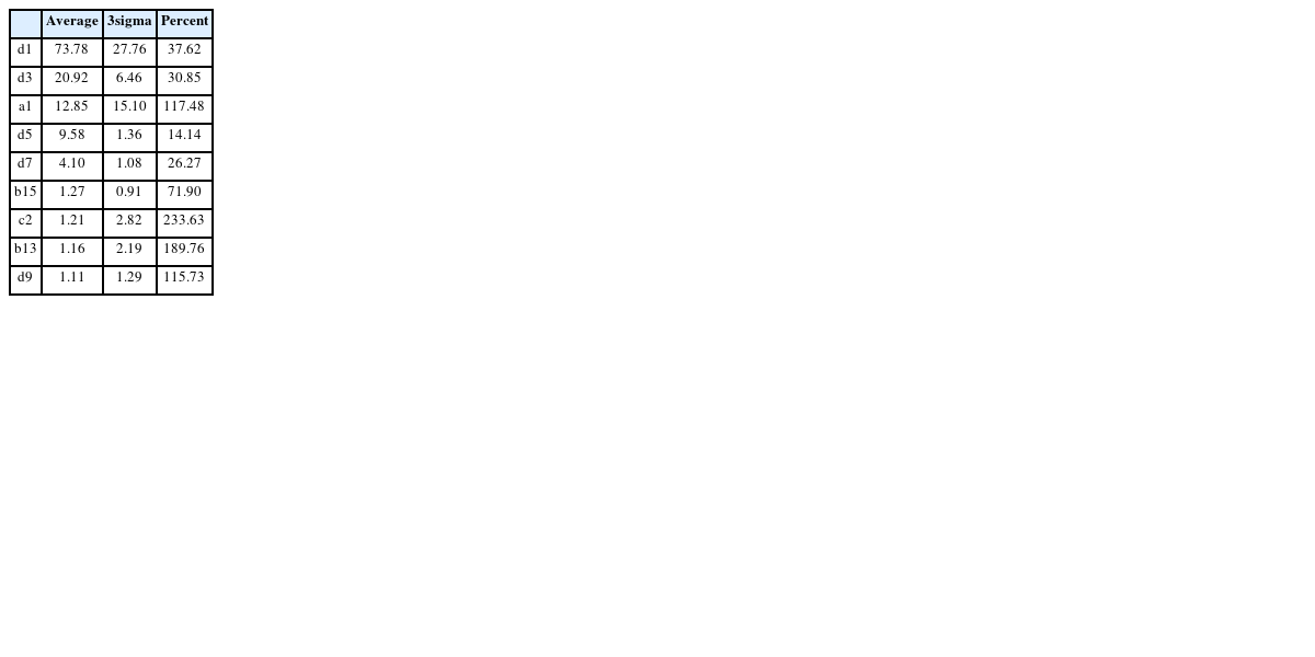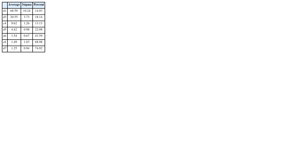 Table 2는 일반 패턴과 불량 패턴의 EFD 계수들의 평균과 오차의 3시그마, 3시그마와 평균의 비율을 보여준다. 이 중, 평균값 자체가 1 이하로 작아서 백분율이 커 보이는 항목을 제외하고, 평균값이 4이상인 계수를 비교하였을 때, 일반 패턴에 비하여 불량 패턴의 EFD 계수 변화 비율이 더 높은 수준을 보이는 것을 확인할 수 있었다.