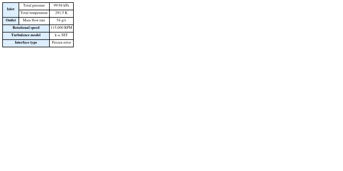 압축기 입구에서는 일반적으로 미세한 크기의 음압(Negative Pressure)이 발생한다. 따라서, 정상 작동으로 가정한 압축기의 입구 압력(99.94 kPa)을 경계조건으로 사용하였고, 시험적으로 측정된 작동 유량인 54 g/s를 출구 경계조건으로 활용하였다. 본 압축기의 실제 작동 조건인 115,000 RPM을 대상으로 연구는 수행되었다. 시험 조건과 동일한 경계조건 설정을 위해
