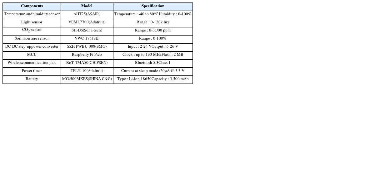 2 센서, 토양수분센서 등 4개의 센서를 하나의 모듈로 구성하였다. 모듈 제어를 위한 MCU로는 RasberryPi PICO를 활용하였고, 무선통신 모듈로는 안테나 부착형 블루투스 5.3버전의 Class1 출력를 갖는 부품을 선정하여 넓은 무선통신 범위를 갖도록 하였다. 모듈 전력 공급을 위해서는 18650 규격의 리튬이온 베터리를 활용하였고 절전모드(Sleep Mode) 구현을 위해서 TPL5110 전력 타이머 모듈을 사용하였다. 부품별 세부 사양은