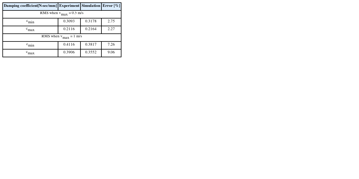 Table 1과 같은 사양을 갖는 댐퍼 모델을 선정하였다. 해당 모델은 12단계로 감쇠력을 조절할 수 있는 반능동 댐퍼이다.