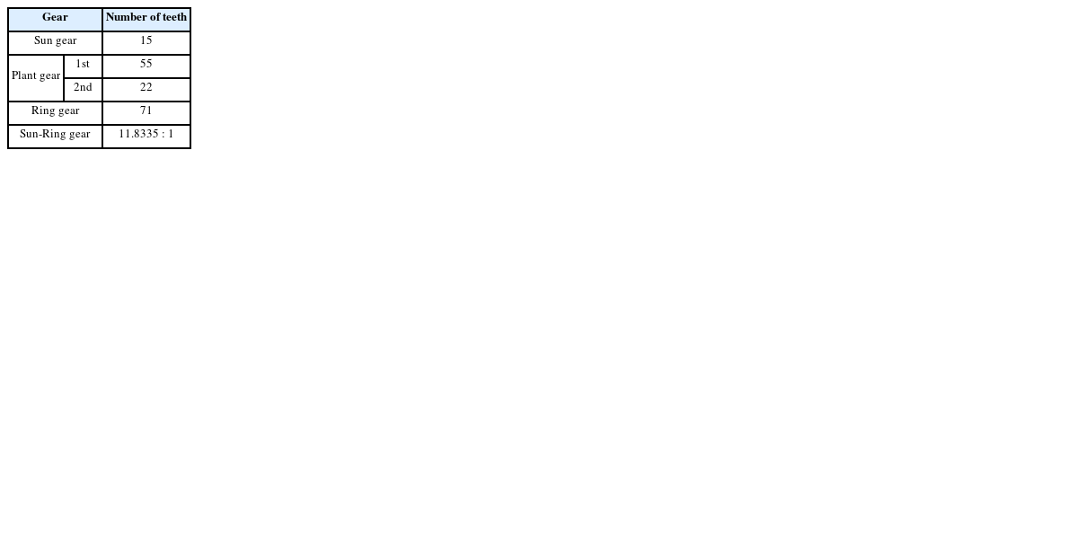 Table 1에 기어들의 잇수를 정리하였다. 선 기어와 유성 기어 1단 사이의 기어 비는 3.6667 : 1이고 유성 기어 2단과 링 기어 사이의 기어 비는 3.2273 : 1이다. 따라서 선 기어(입력 기어)와 링 기어(출력 기어) 사이의 기어비는 11.8335 : 1이다.