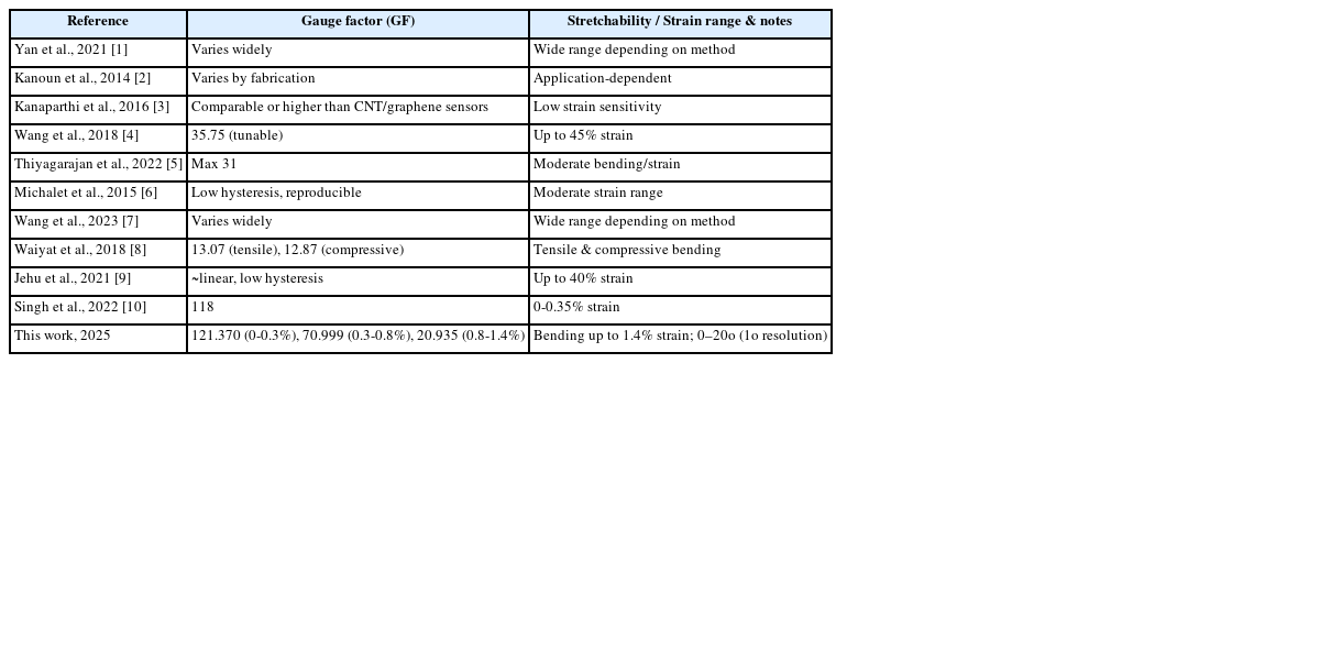 Table 2.Comparison of gauge factor (GF) and stretchability/strain range between this work and previous studies