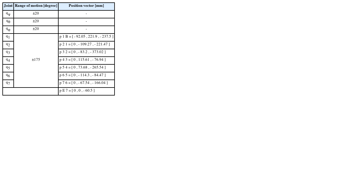 TE7는 각각 평행 이동 정보만 있는 변환행렬이다. A(q)는 인접한 링크 프레임 간의 동차 변환행렬이다. 이 방법을 기반으로 하여, Monte Carlo 방법을 수행한다. 이 방법에서 사용된 랜덤 데이터의 개수는 200,000개로 하였다. 이식에 활용되는 관절들의 범위나 위치 벡터는