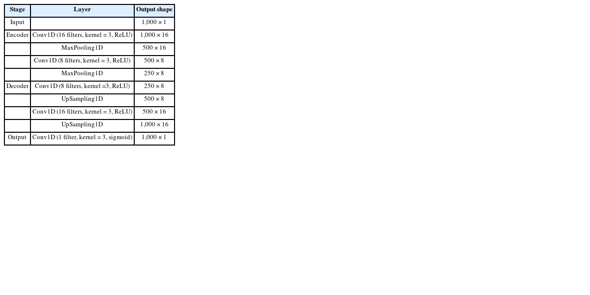 9]. Building on this analysis, the second objective is to characterize the distribution of SNR and degradation patterns across sensors, enabling investigation of sensor-specific aging mechanisms and evaluation of signal restoration feasibility. Third, a one-dimensional convolutional autoencoder model was employed to reconstruct degraded EMG signals [